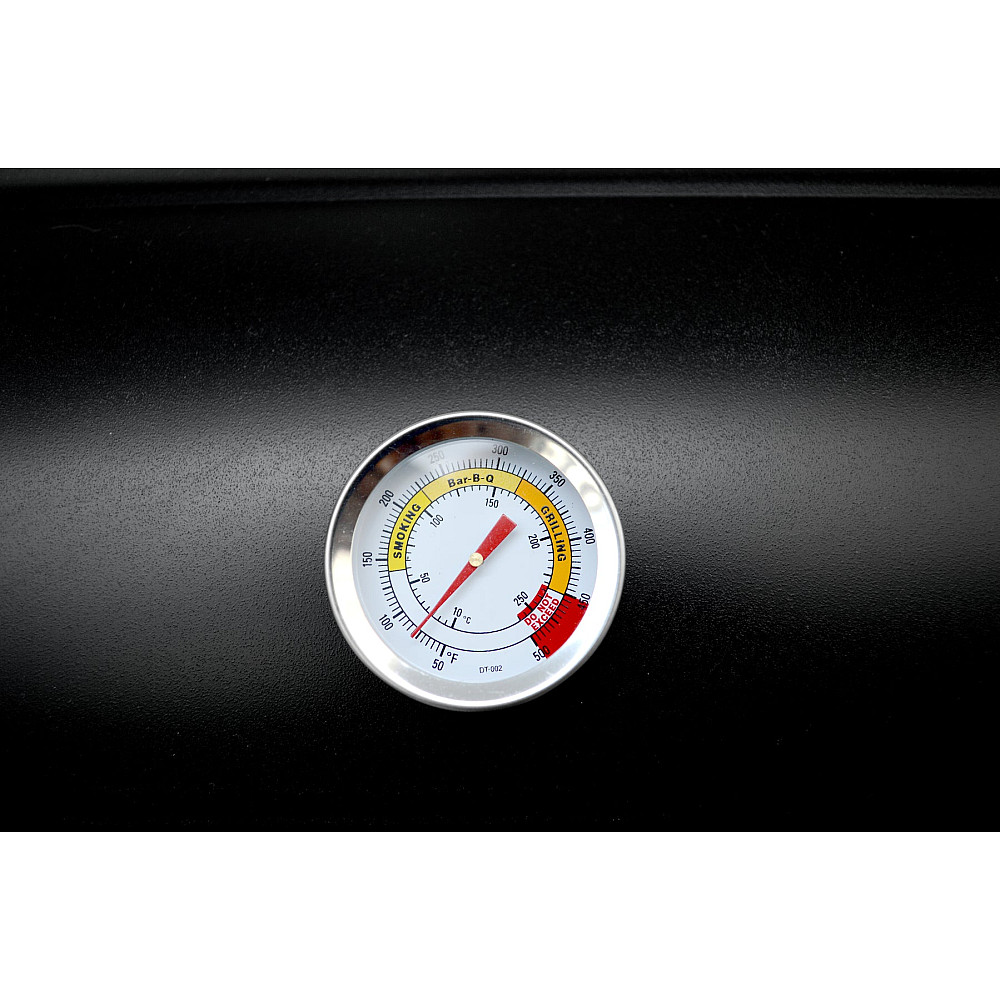 Stabil konstruktion med smarta detaljer. De emaljerade stålgallren är både hållbara och enkla att rengöra, medan den integrerade termometern i locket gör det lätt att hålla rätt temperatur genom hela tillagningen. Den praktiska fronthyllan ger extra arbetsyta för redskap, kryddor och tillbehör.