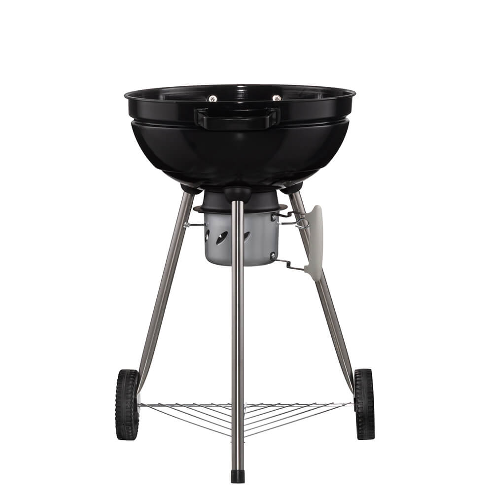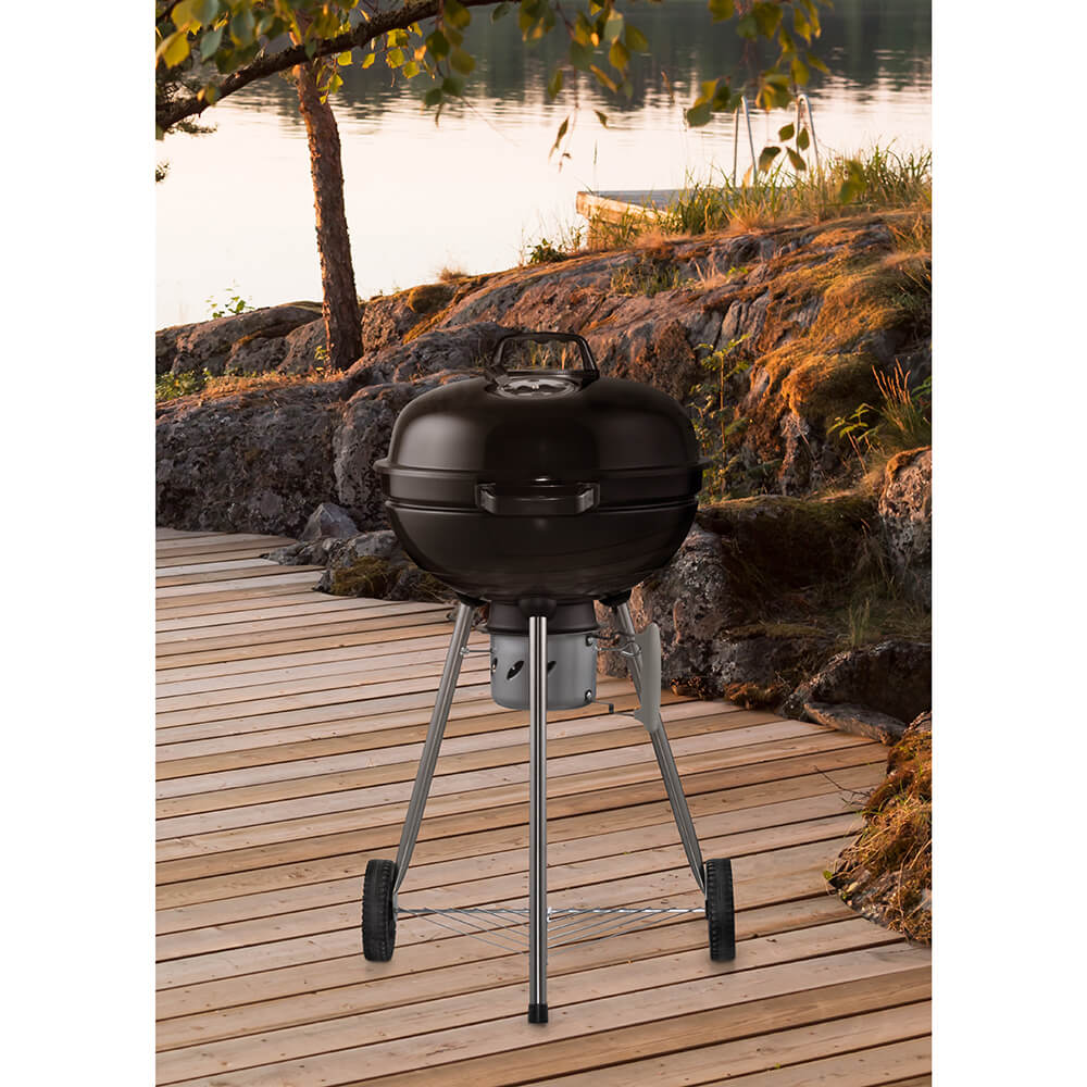 Designad för praktisk användning Grillen har robusta handtag och två stora hjul som gör den enkel att flytta. Den emaljerade ytan skyddar grillen mot värme och väderpåfrestningar.