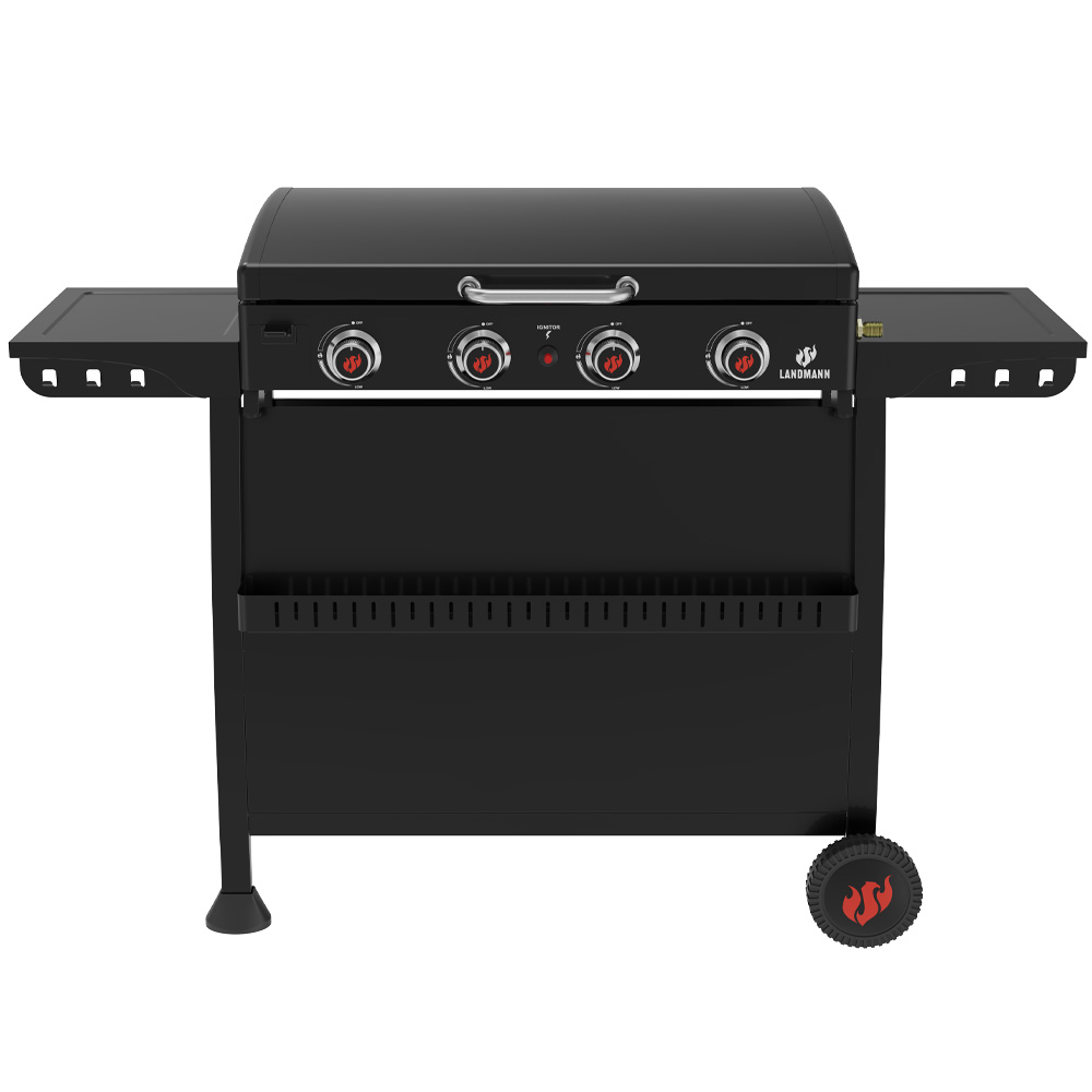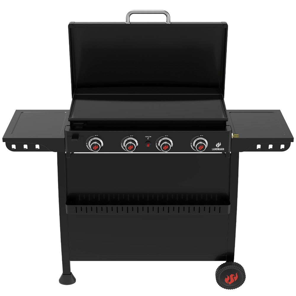 Specifikationer i korthet. Landmann Plancha 4.0 har fyra gasolbrännare à 2,5 kW, emaljerad stekyta 75,5 × 33,5 cm, avtagbar överdel för tabletop-användning, sidobord med redskapskrokar, förvaringshylla, pulverlackerad stålkonstruktion och stora hjul för enkel förflyttning-en komplett stekhäll för allt från frukost till festmiddag.