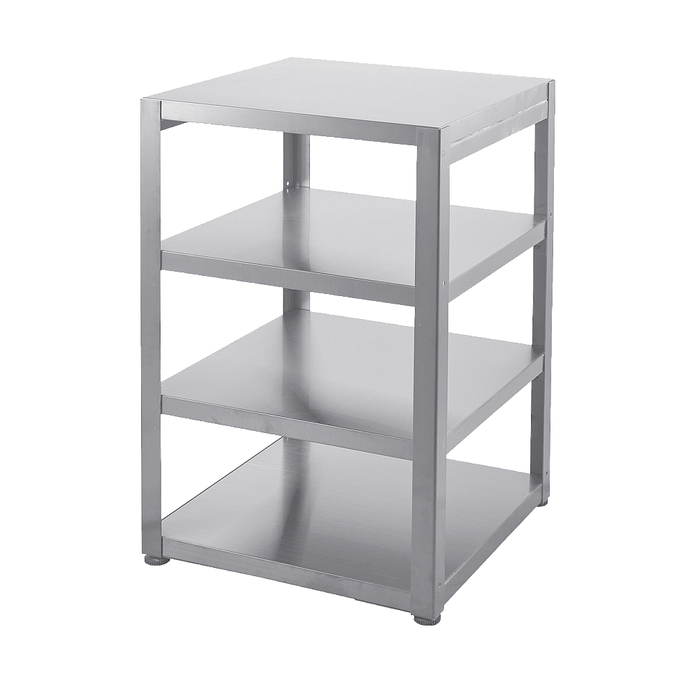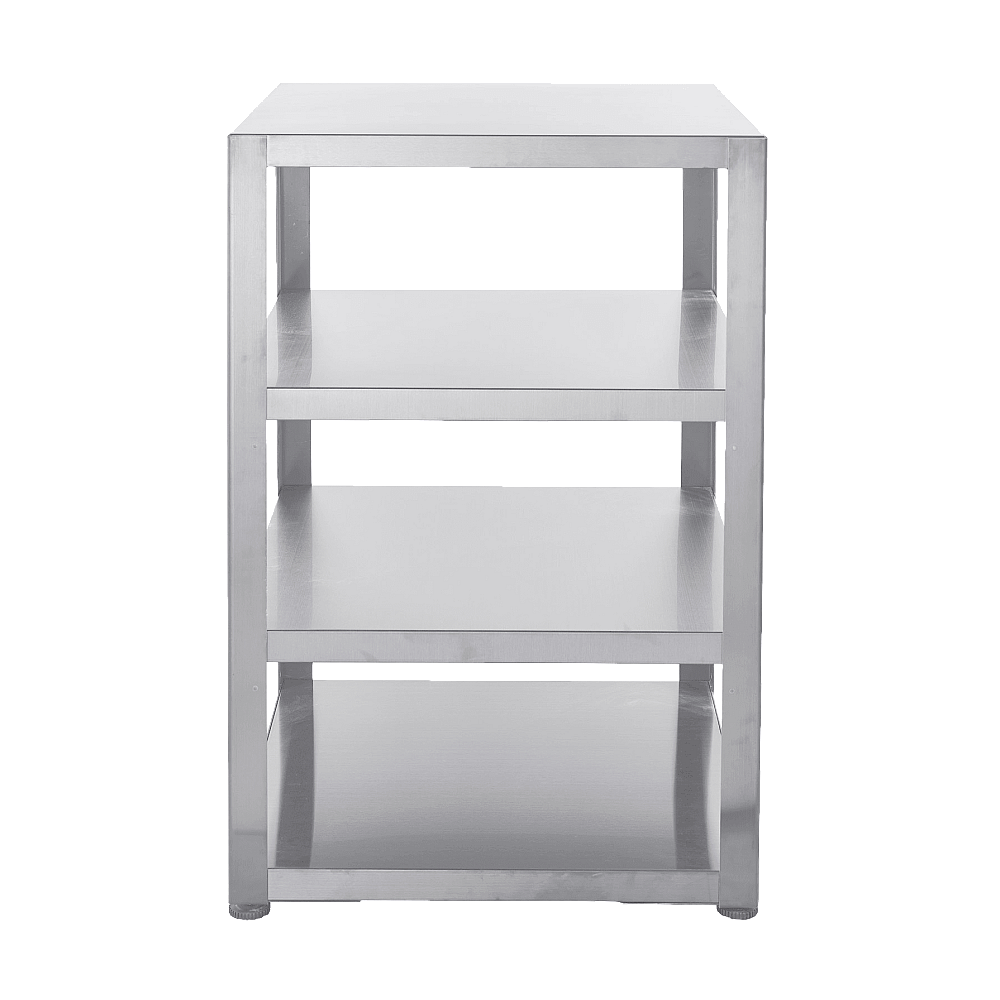 Generös och öppen förvaring. Under arbetsbänken finns tre rymliga hyllplan som erbjuder gott om plats för redskap, skålar och andra tillbehör. Den öppna konstruktionen gör det enkelt att nå det du behöver under grillningen.