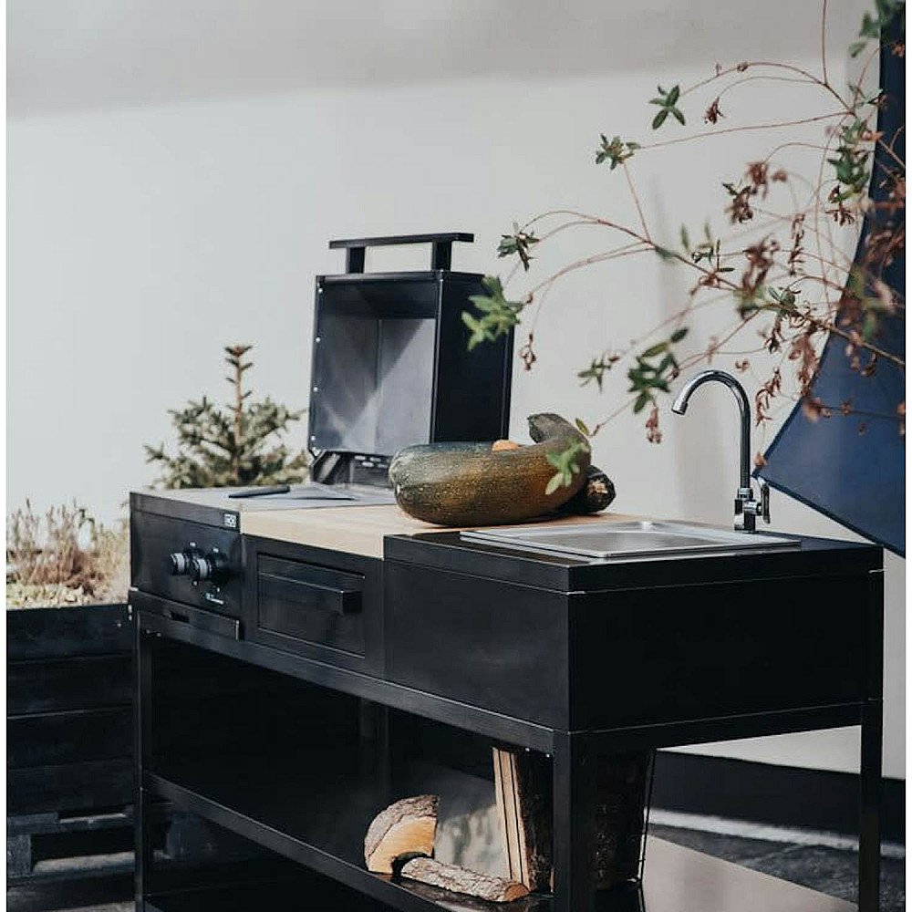 Ett kompakt utekök med smarta funktioner och stilren nordisk design. Myoutdoorkitchen Nordic Line Reykjavik är ett mindre fristående modulkök som passar perfekt för dig som vill laga mat utomhus men har begränsat utrymme på altan, balkong eller uteplats. Med sin svarta finish och minimalistiska utformning får du ett utekök som kombinerar funktion och design på ett enhetligt sätt.