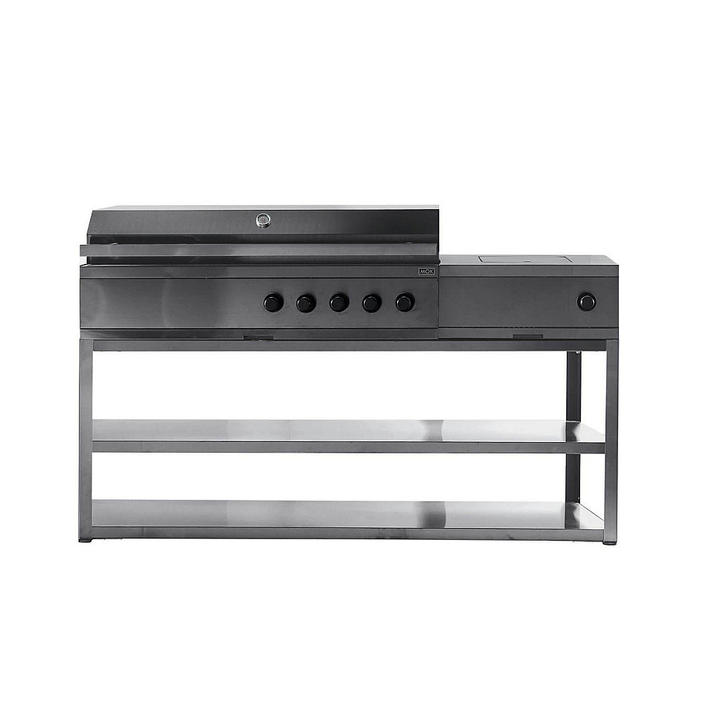 Specifikationer. Paketet inkluderar en fristående basmodul 180 cm samt två integrerbara moduler bestående av en gasolgrill med fem brännare och en sidobrännare. Total bredd är 180 cm, djupet på modulerna är 60 cm utan handtag och höjden från mark till bänkskiva är 95 cm inklusive justerbara fötter. Totalt antal moduler är tre.