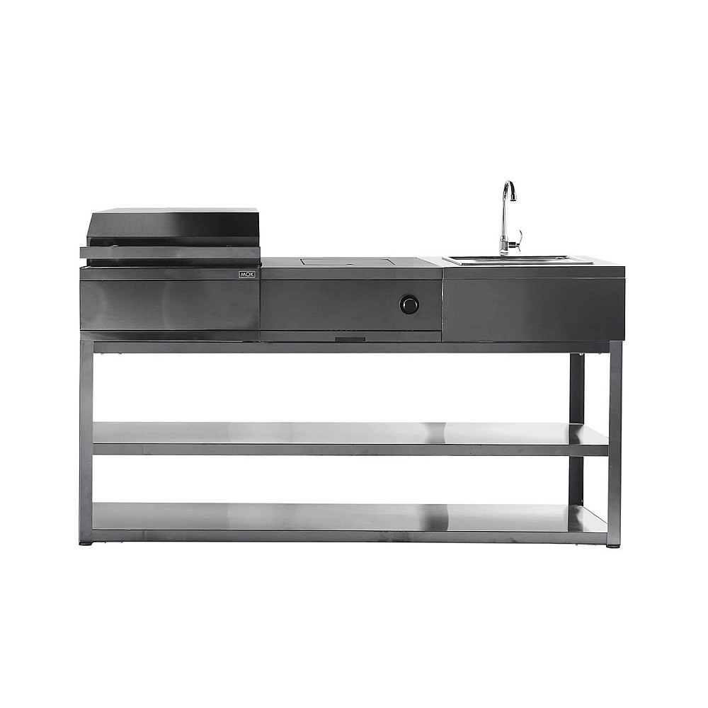 Specifikationer. Paketet inkluderar en fristående basmodul 180 cm samt tre integrerbara moduler bestående av en kolgrill, en sidobrännare och en vaskmodul. Total bredd är 180 cm, djupet på modulerna är 60 cm utan handtag och höjden från mark till bänkskiva är 95 cm inklusive justerbara fötter. Totalt antal moduler är fyra.