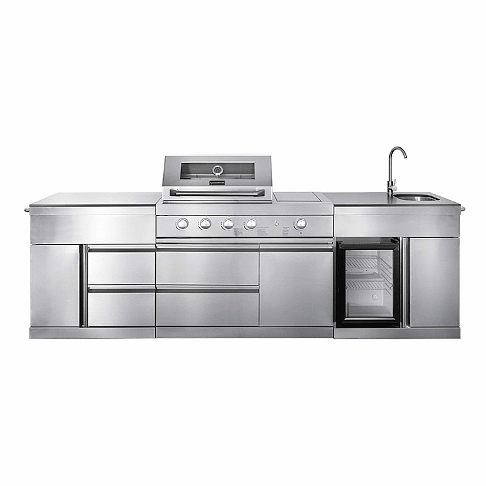 Komplett fristående utekök i stilren rostfri design. Myoutdoorkitchen Pure Plus Stainless är ett färdigt utekökspaket som ger dig en komplett lösning för matlagning utomhus. Med grill, kylskåp, diskbänk och extra förvaring får du ett funktionellt utekök i autentisk amerikansk stil som passar perfekt på altanen, terrassen eller uteplatsen.