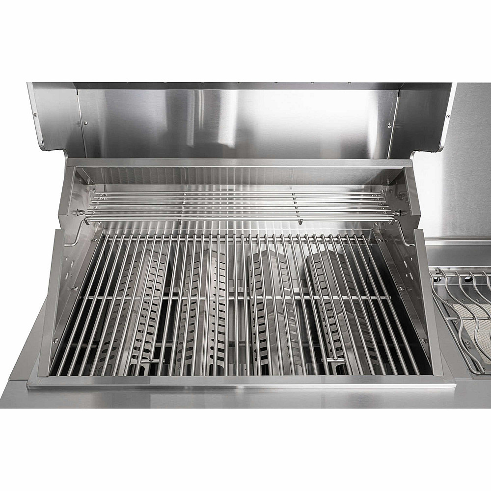 Kraftfull gasolgrill med infraröd sidobrännare. Uteköket är utrustat med en stor gasolgrill med fyra brännare och en infraröd sidobrännare som ger dig fler möjligheter vid matlagningen. Du kan grilla, steka och tillaga tillbehör samtidigt, vilket gör det enklare att laga kompletta måltider och servera direkt från uteköket.