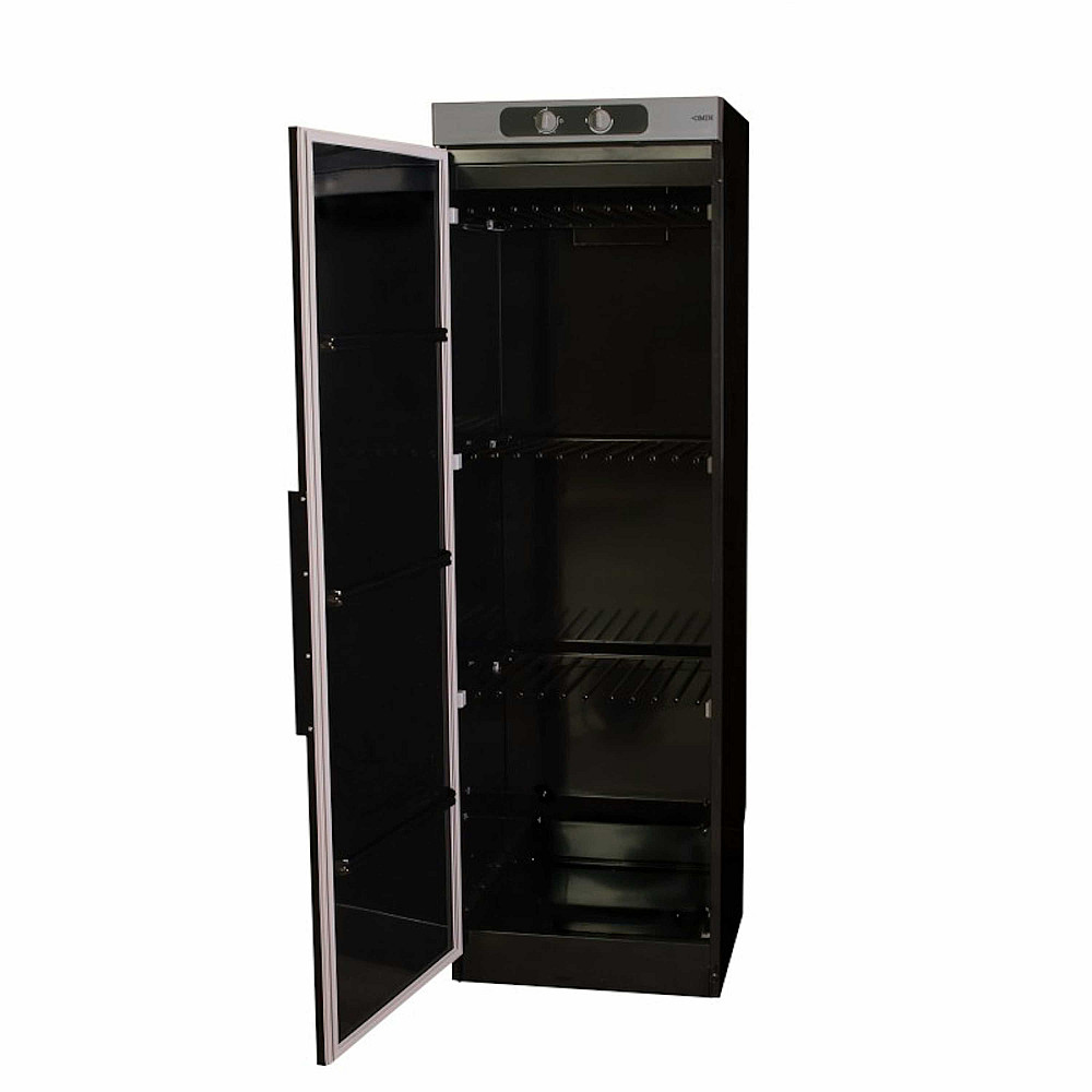 Det robusta torkskåpet är utrustat med 2 kW värmeelement, frånluftssystem och ventilationsanslutningar. Den vänsterhängda dörren och de justerbara fötterna gör placering och installation enkel, och den svarta finishen ger ett modernt och stilrent uttryck.