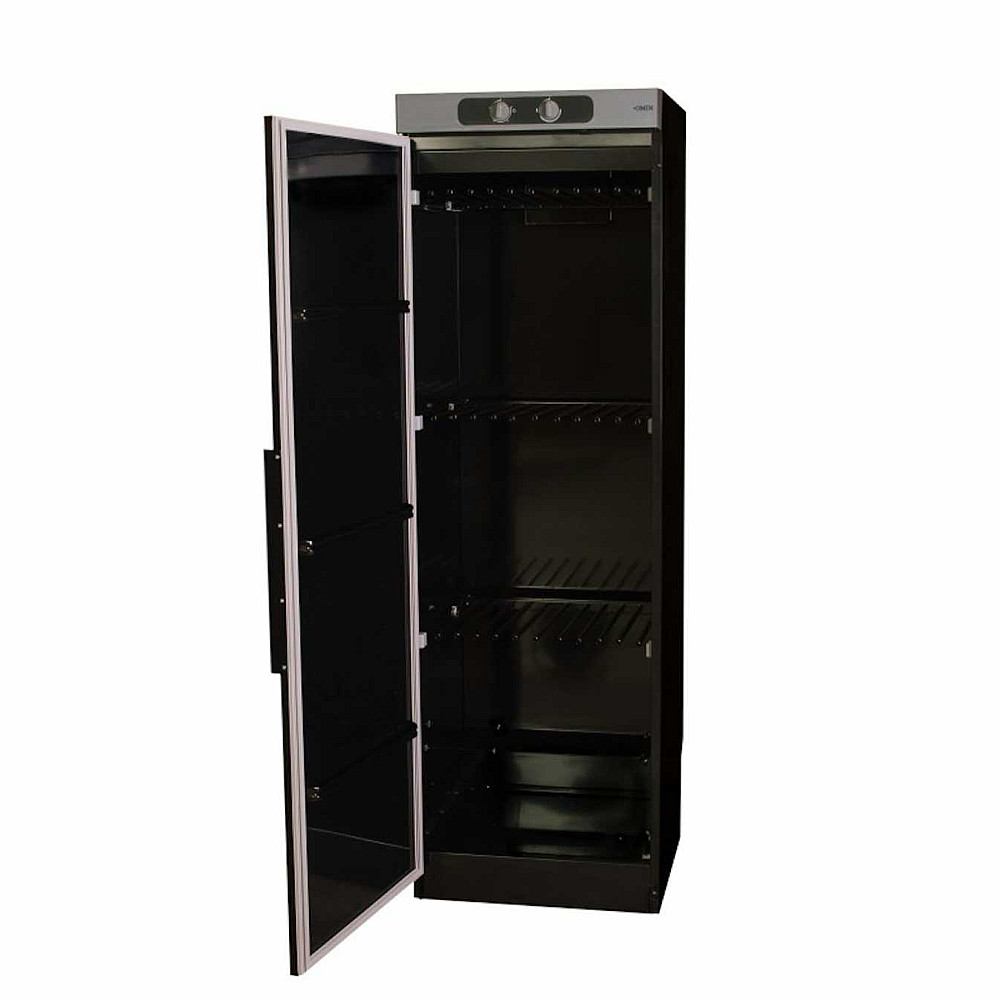 Det slitstarka torkskåpet är utrustat med 2 kW värmeelement, frånluftssystem och praktiska ventilationsanslutningar. Vänsterhängd dörr och justerbara fötter underlättar installationen, medan den svarta finishen ger ett modernt och stilrent uttryck.