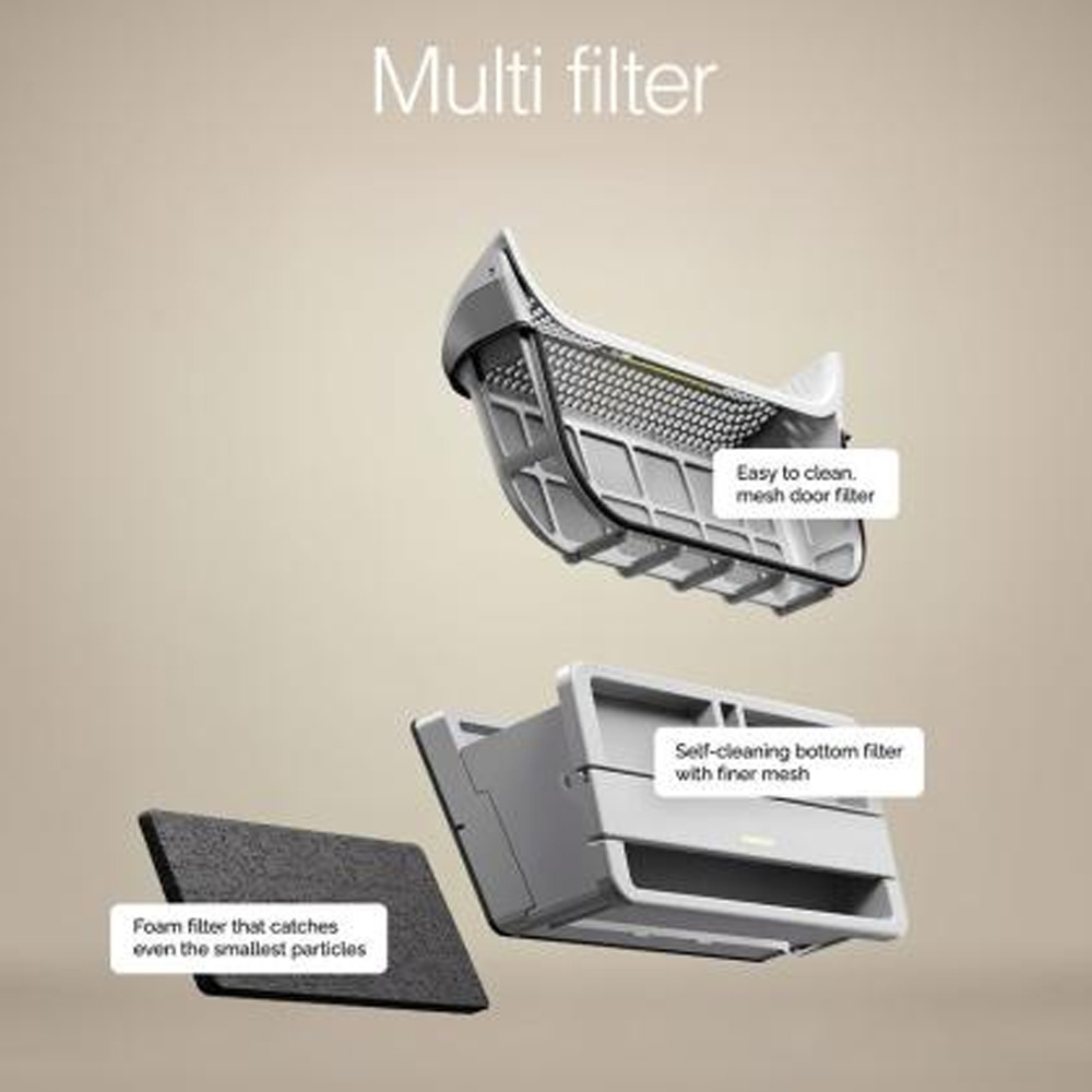 Multifiltersystemet med tre filter skyddar maskinen mot ludd som annars kan försämra prestandan. Systemet bidrar till jämn drift över tid och är särskilt fördelaktigt för allergiker och astmatiker.