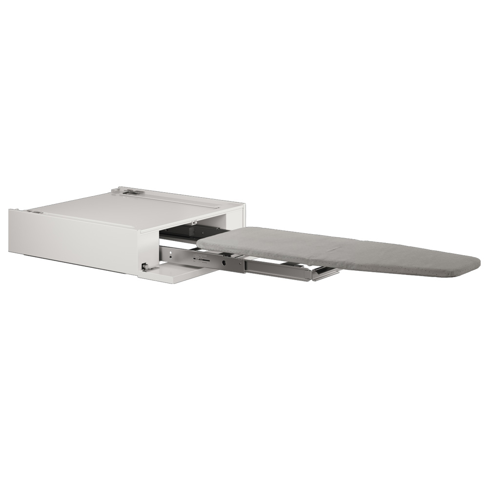 Välj ett sorteringshyllplan som kombinerar praktisk funktion och diskret design. HI150W är perfekt för dig som vill maximera utrymmet mellan maskinerna och alltid ha en integrerad strykbräda nära till hands i tvättstugan.