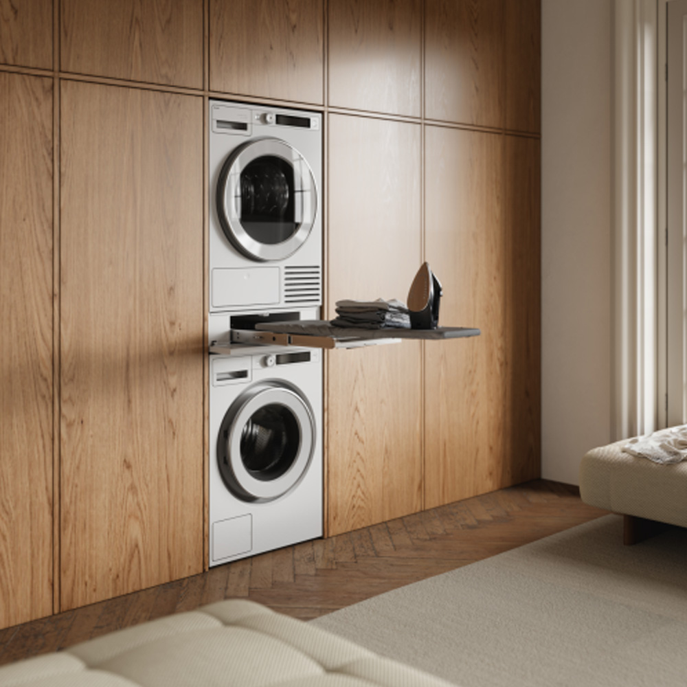 Skapa en smart och ergonomisk tvättzon med ASKO HI150W, ett sorteringshyllplan med utdragbar strykbräda som integreras mellan tvättmaskin och torktumlare. Du får en funktionell arbetsyta och en diskret stryklösning utan att ta extra plats.